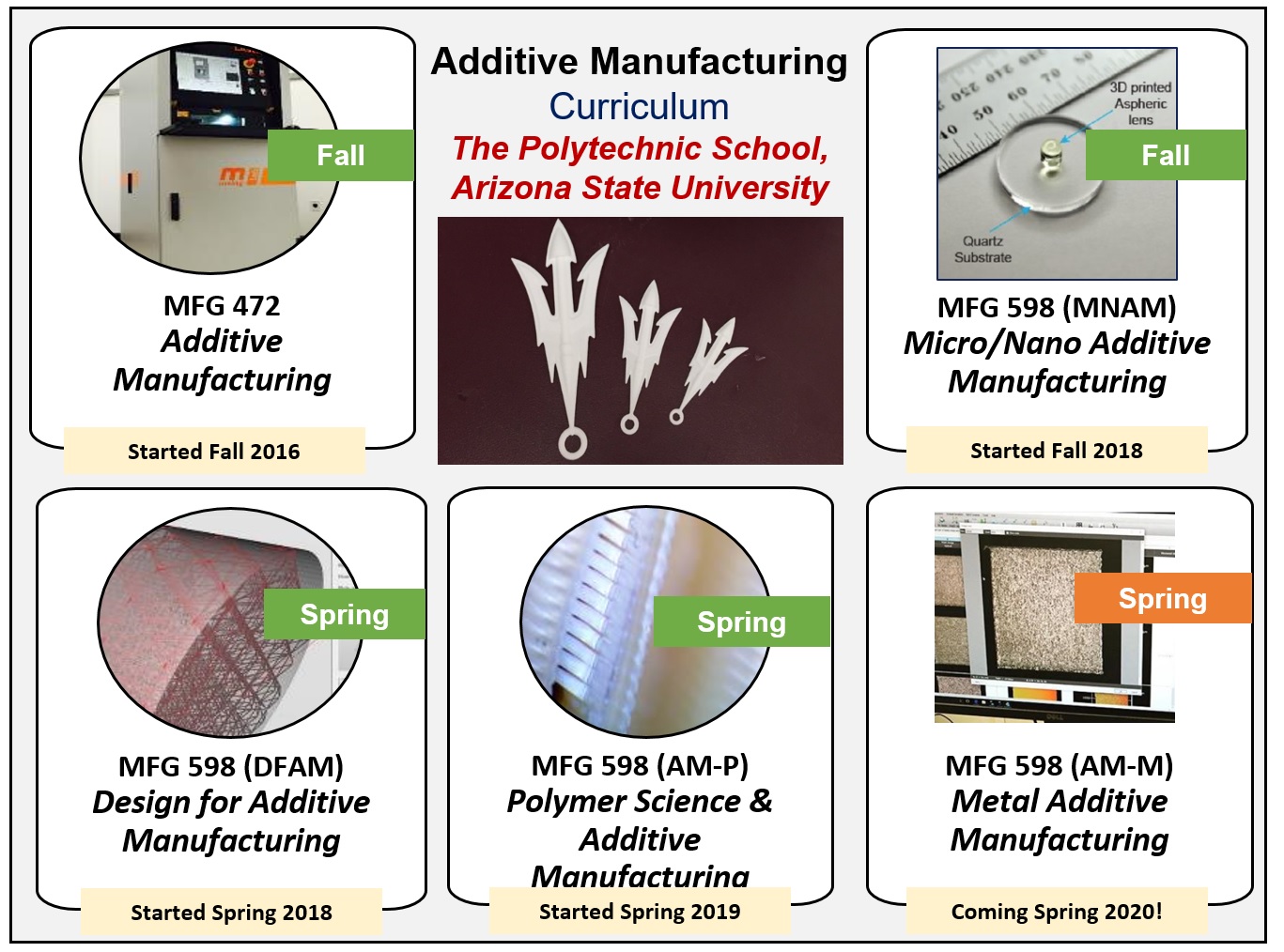 Over a year ago, I wrote a blog post discussing the Additive Manufacturing (AM) equipment we have at Arizona State University (ASU), most of it part of a $2M (and since growing) investment at the Polytechnic School’s Innovation Hub. This post introduces a lesser-known aspect of our overall AM effort at ASU, and that is the curriculum around AM that we have developed rather organically over the past 2 years. Today, several students at ASU are stringing these courses together based on their interests, at the BS, MS and PhD levels. Over 200 students have enrolled in these courses so far.
