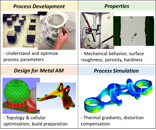 This course, offered for the first time in the Spring of 2020, provides an overview of different metal 3D printing processes, and an in-depth look at the most widely used one: the laser powder bed fusion process. For this process, the course is divided into 4 modules: process development (hands-on metal 3D printing), properties (characterization and testing), design for metal AM (use of design, and build preparation software), and process simulation (use of simulation software) – see Figure 4. This course too is taught with the flipped model, reserving classroom time for hands-on activities.